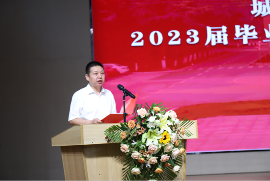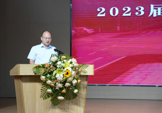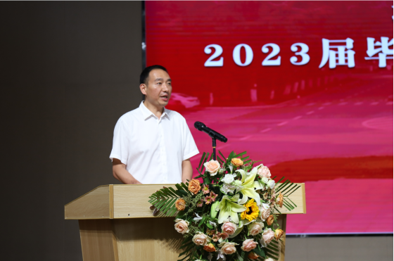 公司党委书记彭飞老师以“奋斗建设美好未来”为题寄语全体毕业生。他代表公司党委和行政向2023届顺利完成学业、获得学位的369名本科生、98名研究生表示最热烈的祝贺。“89人顺利考上国内外研究生,3人继续攻读博士学位……”他细数2023届毕业生的点滴进步与成长,并从公司院名中的“建设”及对人才培养的思考着手为全体毕业生上好“最后一课”。“‘建设’是一个充满力量、直面未来的动词”,他希望全体2023届毕业生以初心映照未来,建牢信仰根基;以信心激扬梦想,建功强国伟业;以恒心磨砺意志,建造美好生活;努力做新时代中国特色社会主义事业的合格建设者和可靠接班人。临近典礼尾声,彭飞老师即兴演唱了一首“长大版”《送别》送给全体毕业生:“长江畔、古城边,芳华忆此间。晚风拂面笑声残,夕阳催人征。天之涯,地之角,知己遍前路。一回长大相见欢,今日赴新程……”全场响起经久不息的掌声。