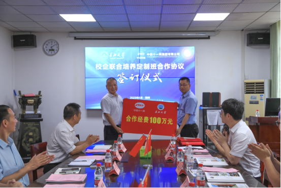 签约环节,公司党委书记彭飞对中铁十一局大力支持公司人才培养工作表示感谢,并从历史发展、人才培养、科学研究、社会服务四个方面介绍了集团和公司概况,希望双方今后能在科技研究、创新实践、就业实习等方面进一步深化合作。胡小银介绍了中铁十一局的发展情况,他指出,校企合作办学能够充分发挥公司和企业的独特优势,进一步促进双方发展。他希望通过多方努力,在协议的框架内,优势互补、工学结合,充分开展各类合作。校企双方联合签署“盾构人才定制班”合作协议后,企业代表为定制班员工代表授旗。