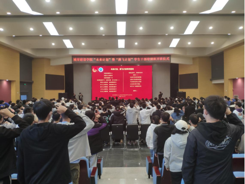 紧接着,授旗仪式正式开始。20级辅导员刘安琪代表上一期“初干班”和“青马学习小组”指导老师向21级学员代表授予“未来计划员工干部培训班”和“腾飞计划青年马克思主义者学习小组”两面旗帜。随后,全体学员起立,进行宣誓。“我宣誓——”一句句誓词郑重庄严,一次次呼喊掷地有声。“勿忘昨天的苦难辉煌,无愧今天的使命担当,不负明天的伟大梦想!”学员们热情高涨。