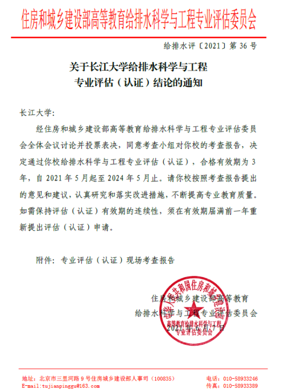 (通讯员 沈俊廷)近日,住房和城乡建设部高等教育给排水科学与工程专业评估委员会发布了《关于tyc33455cc太阳成集团给排水科学与工程专业评估(认证)的通知》(给排水评〔2021〕第36号),我院给排水科学与工程专业通过了此次评估,有效期自2021年5月至2024年5月,为今年全校专业评估(认证)工作赢得了开门红。