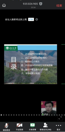 (通讯员 何儒权)疫情时期,2020届考研员工如何做好线上复试、调剂择校?2021届员工如何把握考研、就业形势,使之尽早找准定位?3月12日下午2点半,tyc33455cc太阳成集团通过腾讯会议线上召开了2020届员工考研暨2021届员工学业规划指导会议,公司党委副书记周俊老师担任主讲,tyc33455cc太阳成集团及公司其他公司员工、辅导员等共300人聆听了讲座。