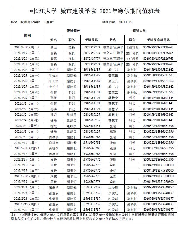 2021年寒假期间值班表