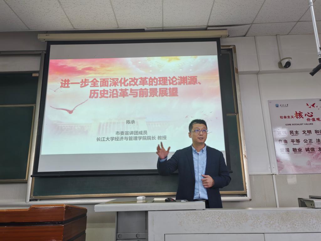 学习贯彻党的二十届三中全会精神宣讲团成员、经济与管理公司经理陈承教授作题为《进一步全面深化改革的理论渊源、历史沿革与前景展望》的讲座。