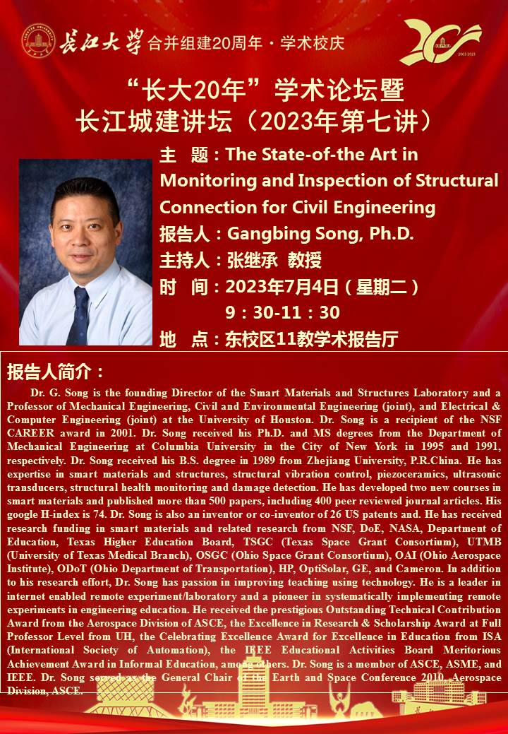 “长大20年”学术论坛暨长江城建讲坛(2023年第七讲):The State-of-the Art in Monitoring and Inspection of Structural Connection for Civil Engineering