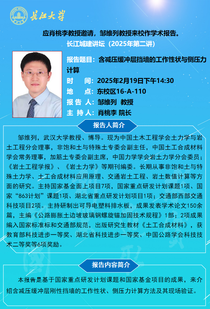 长江城建讲坛2025年第二讲:含减压缓冲层挡墙的工作性状与侧压力计算