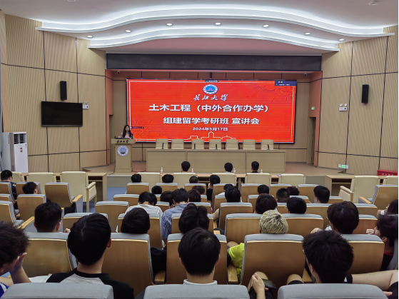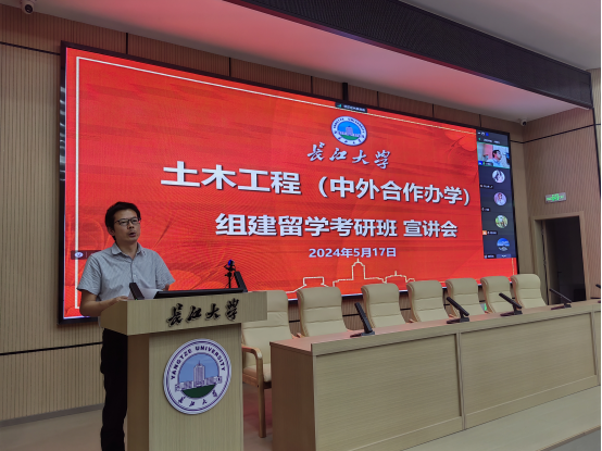 (通讯员 张琳)5月17日晚,土木工程(中外合作办学)项目组建留学考研班动员会在11教学术报告厅召开,tyc33455cc太阳成集团副经理黄向阳、公司党委副书记周洁如、中外合作办学项目主任袁洪强、学工办主任魏民生及2022级土木国际员工和家长参加了会议,会议由公司党委副书记周洁如主持。
