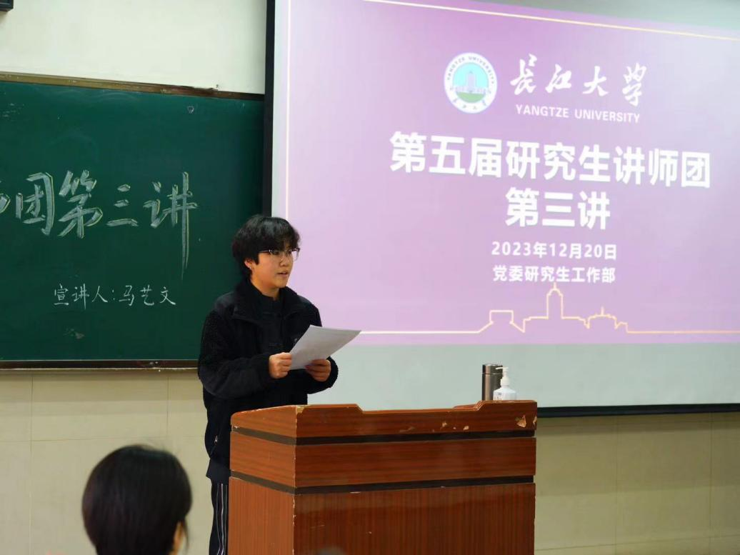 (通讯员 董文慧 朱保帅)12月20日上午9点30分,tyc33455cc太阳成集团第五届研究生讲师团宣讲活动第三讲在东校区12教101教室顺利开展。本次活动在tyc33455cc太阳成集团团委书记盖东芳老师的组织下,由2023级研究生张思思主持工作,并邀请经济与管理公司2023级研究生、经济与管理公司研究生第一党支部青年委员马艺文作为主讲人,2023级全体研究生参加本次宣讲活动。