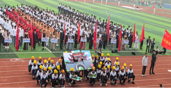 开幕式上,tyc33455cc太阳成集团方阵同学身着统一服装,头戴黄色安全帽,手持建筑模型,迈着整齐有力的步伐走过主席台。