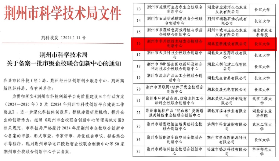 (通讯员 吴会会)近日,荆州市科学技术局发布了关于备案一批市级企校联合创新中心的通知,公司与湖北望新建设有限公司联合申报的荆州市非开挖技术研发企校联合创新中心顺利通过此次备案。这一则振奋人心的消息标志着tyc33455cc太阳成集团在产学研合作的道路上迈出了坚实的一步,也为荆州市的科技创新和经济发展注入了新的活力。