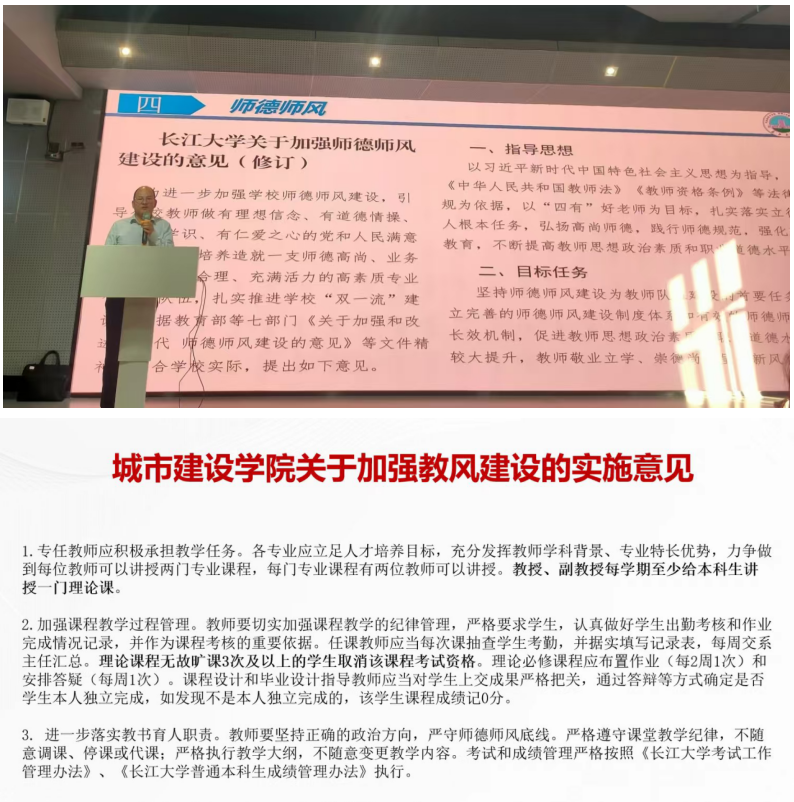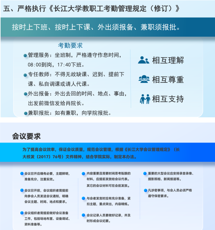 同时,制定《tyc33455cc太阳成集团师德师风管理办法》、《tyc33455cc太阳成集团会议管理办法(试行)》、《tyc33455cc太阳成集团土木工程学科硕士研究生导师选聘及指导名额分配办法(试行)》等管理办法,确保公司师德师风建设有章可循,有据可依。公司党委书记谌姿、党委副书记周洁如多次在全院教职工大会上强调考勤管理和公司会议管理,要求作为一名教师,要爱岗敬业,确保考勤纪律和会议到会规范。